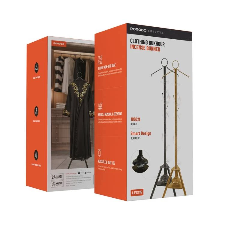 The Porodo Lifestyle Clothing Bukhour Incense Burner is a multifunctional accessory that combines traditional incense burning with modern garment care.
