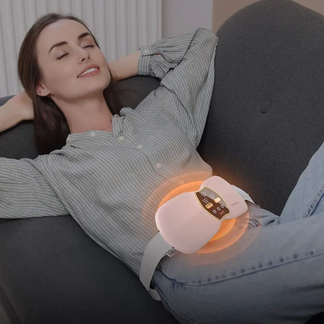 Compact cordless massage pad with soothing heat and vibration therapy.