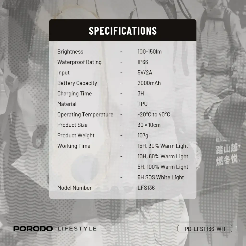 Porodo Inflatable Outdoor Magnetic Tube Light / 150 Lumens / Light Memory / 15Hrs - LFS136