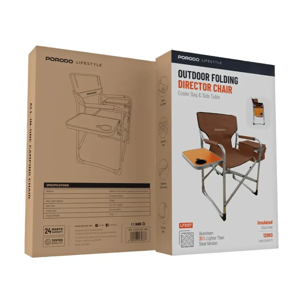 The Porodo Lifestyle Outdoor Folding Director Chair (LFS137) offers strength, comfort, and convenience for outdoor enthusiasts. Made from durable 600DPE Oxford fabric with a reinforced aluminum frame and silver oxidation surface, it is lightweight yet strong, supporting up to 120kg. Measuring 53×107×85cm when open and folding compactly to 53×60×85cm, it is easy to store and transport. The chair includes a built-in cup holder, a padded and detachable fabric armrest for added comfort, an anti-slip base, and an insulated cooler bag to keep snacks and drinks chilled. Perfect for camping, fishing, picnics, or any outdoor activity, it combines functionality, portability, and durability.