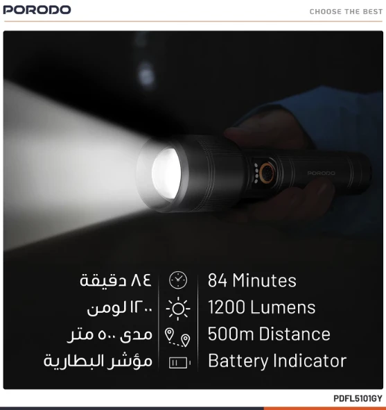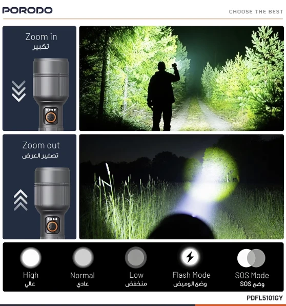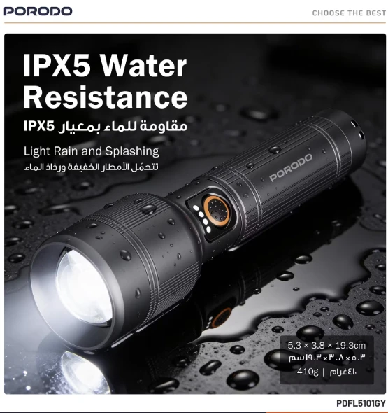 A powerful and practical rechargeable handheld flashlight designed for everyday use, outdoor trips, and emergencies. It delivers a long-range beam with manual zoom to switch between wide flood lighting and focused spotlight, runs on a rechargeable battery via USB-C, and features IPX5 water resistance for reliable outdoor performance.