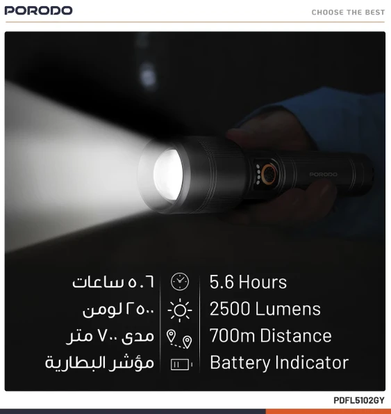 A powerful rechargeable handheld flashlight built for outdoor use, emergencies, and daily tasks. It delivers up to 2500 lumens with a long beam reach of around 700 meters, powered by a large 10000mAh battery rechargeable via USB-C for extended use.