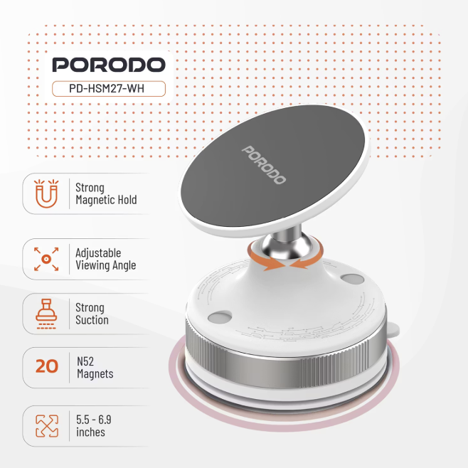 Porodo Vacuseal Smart Suction Magnetic Phone Mount Secure your phone effortlessly with the Porodo Vacuseal Mount. Featuring a powerful N52 magnet and strong suction base, it holds devices from 5.5 to 6.9 inches firmly in place—even on bumpy roads. The adjustable angle ensures optimal viewing for calls, media, or navigation. Made with durable silicone, ABS, and TPE, it's perfect for use at home, work, or in the car. Key Features: Strong N52 magnetic hold Fits phones 5.5" to 6.9" Adjustable viewing angle Secure suction base Durable materials (silicone, ABS, TPE) Ideal for home, office, or car use
