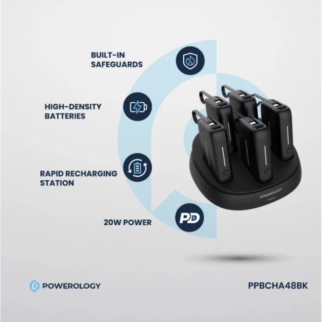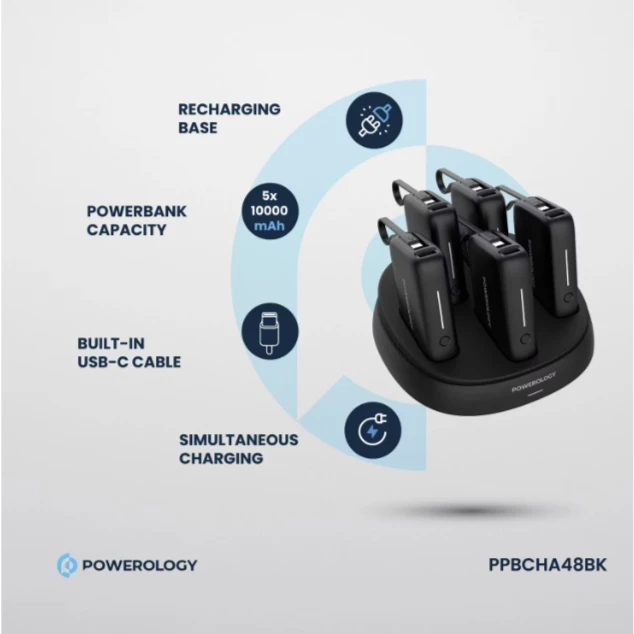 The Powerology × 5 10000mAh Power Bank Station is a versatile, high-performance charging solution for keeping multiple devices powered up simultaneously. It includes five 10000mAh power banks, each with a built-in Type-C cable that efficiently charges a number of devices. The following power bank comes with different output options, including USB-C, USB-A, and cable-Type C, all featuring fast charging: 20W PD, 18W, and SCP 22.5W for quick power delivery. In this model, the charging base is fitted with DC 12V/6A input for fast recharging, while the contact output is up to 60W across five 12W ports, making it ideal for taking care of a number of devices. Equipped with inbuilt overcharge, overheating, and short-circuit protection, this station uses high-density batteries for maximum efficiency. The Powerology × 5 Power Bank Station will be a reliable and efficient charging solution for all your devices, perfect for home, office, or on-the-go use.