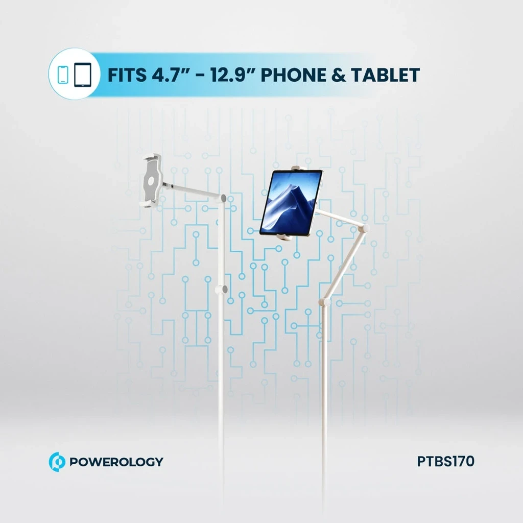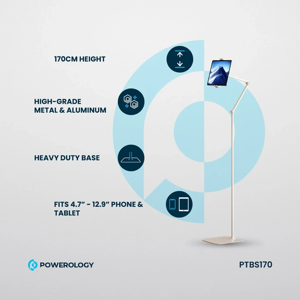 The Powerology Multi-Joint Floor Stand is a versatile and sturdy solution for holding your phone or tablet. Made with high-grade metal and aluminum, this stand features a heavy-duty base and an adjustable height from 110 cm to 170 cm. The 360° rotating head and telescopic arm design provide multiple viewing angles, making it perfect for video calls, watching movies, or reading. Compatible with devices from 4.7" to 12.9" and capable of holding up to 2kg, this stand is a practical addition to any home or office.