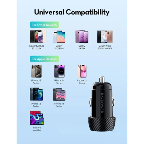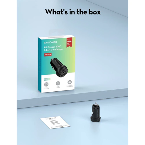 The RAVPower PD Pioneer 20W 2-Port Car Charger is a compact and efficient solution for powering devices on the go. With both USB-C Power Delivery (PD) and USB-A Quick Charge (QC) ports, it enables fast, simultaneous charging for multiple devices. Its sleek and minimal design fits perfectly into any car interior, making it an ideal companion for daily commutes and long drives. Key Features: Dual Charging Ports – USB-C PD and USB-A QC for charging two devices at once Fast Charging – 20W via USB-C and 18W via USB-A for rapid power-ups Universal Compatibility – Works with smartphones, tablets, GPS units, and more Advanced Safety – Built-in protection against overheating, overcharging, and short-circuiting Compact Design – Low-profile build for a neat, unobtrusive fit in any vehicle Stay powered wherever the road takes you with this reliable and travel-friendly car charger.