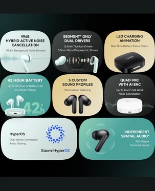 • Advanced Active Noise Cancellation (ANC): Experience immersive audio with ANC capabilities of up to 49dB, effectively reducing ambient noise for clearer sound.