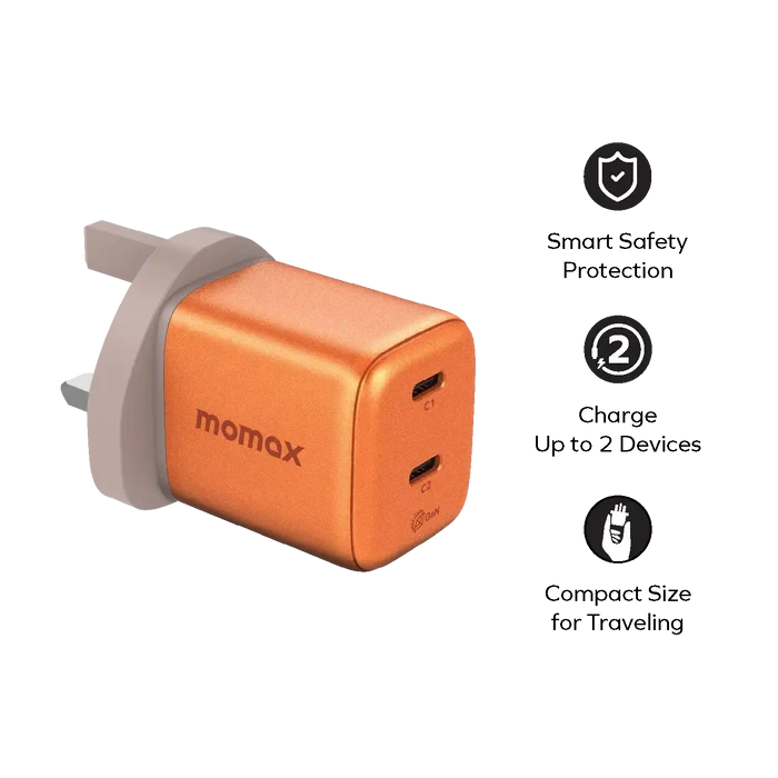 The Momax 1-Charge 45W 2-Port GaN Charger is where power, innovation, and portability meet. Designed with next-generation Gallium Nitride (GaN) technology, it delivers up to 45W of intelligent power while maintaining an ultra-compact size. Its dual-port versatility allows you to charge two devices at once—either at full 45W single output or 30W + 12W split output, making it perfect for laptops, tablets, and smartphones alike.