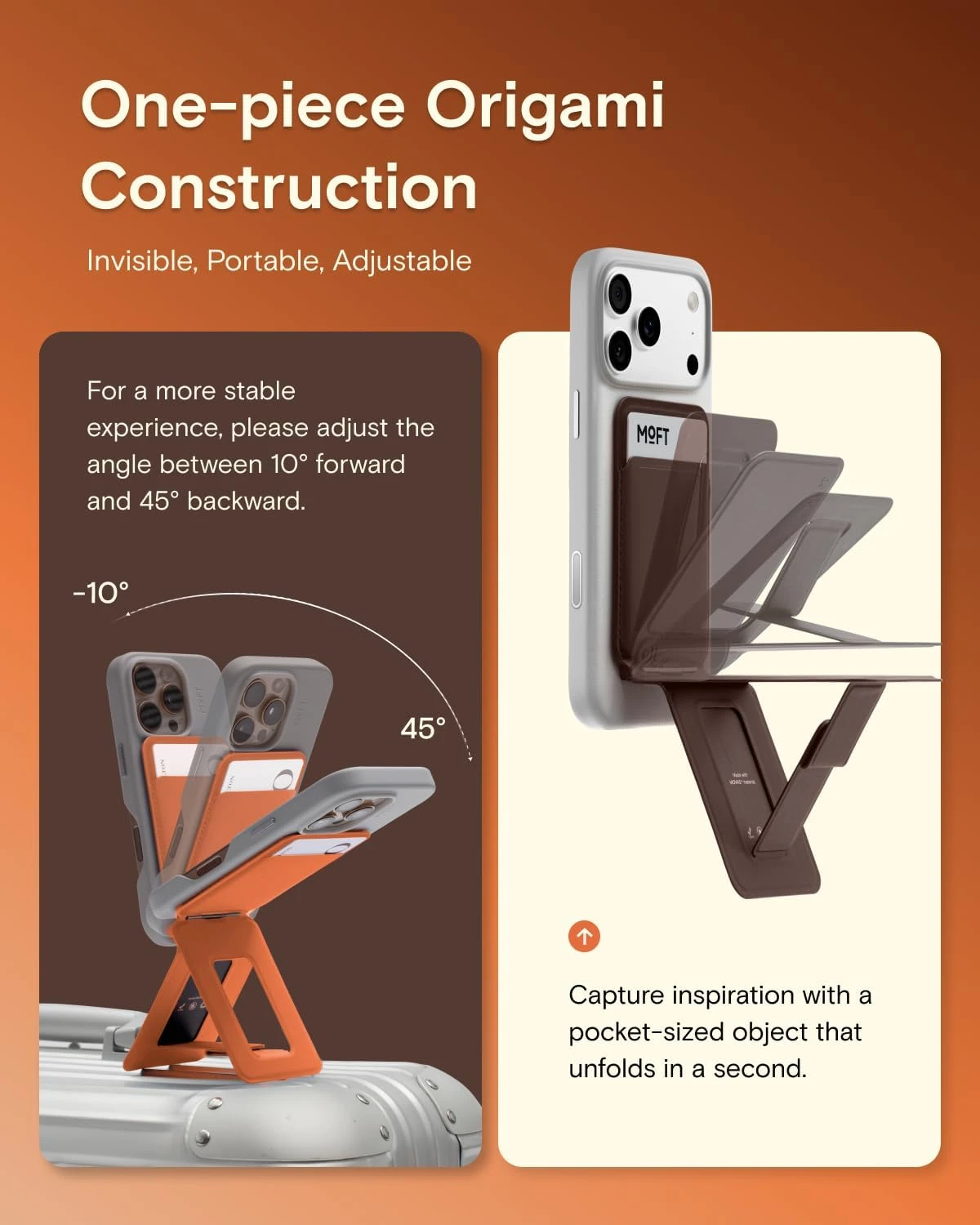 A slim MagSafe accessory that combines a phone tripod, adjustable stand, and card wallet in one clean setup.