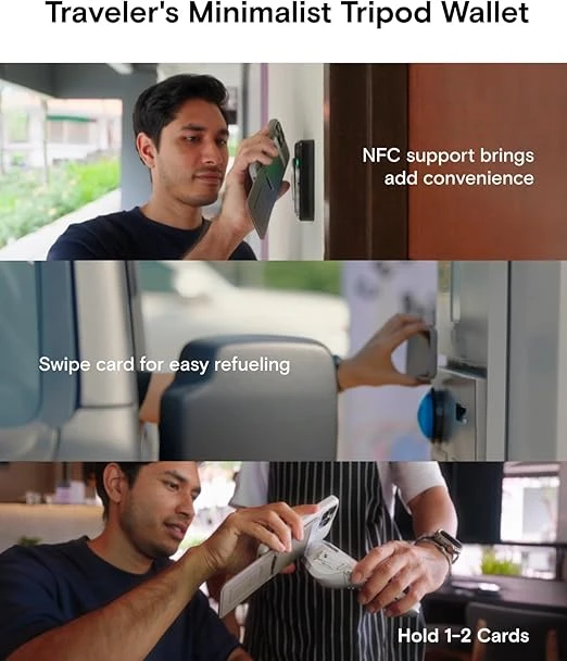 A slim MagSafe accessory that combines a phone tripod, adjustable stand, and card wallet in one clean setup.