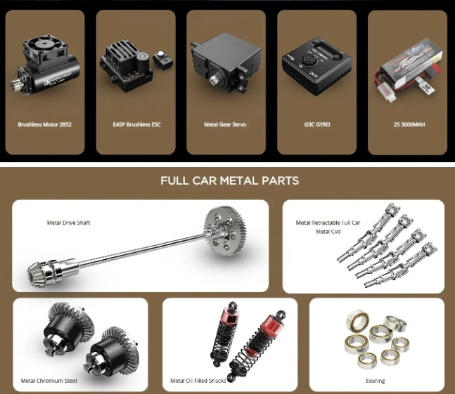 It’s driven by a 2852 brushless motor and 45A ESC (compatible with both 2S and 3S LiPo batteries), hitting speeds up to ~70 km/h on 3S. The package comes ready to run and includes a 2S 3000mAh LiPo battery, 2.4 GHz T3D radio with gyro (control range ~120 m), and a spare set of tires. High-travel adjustable shocks, full metal drivetrain, and full ball bearings ensure great handling and longevity.