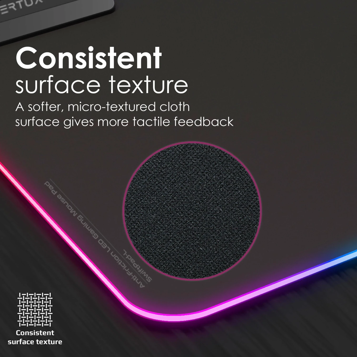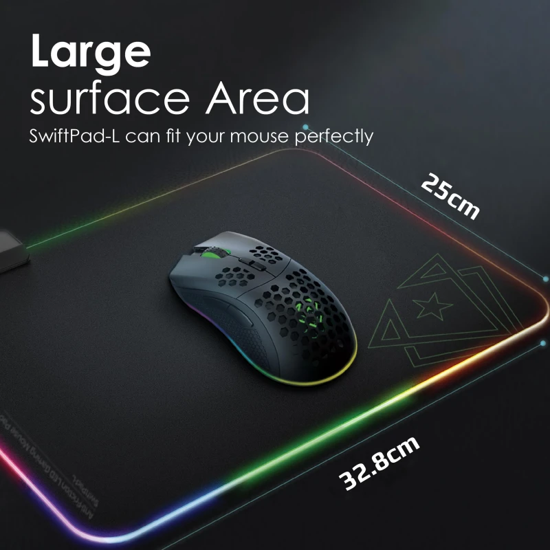 The Vertux SwiftPad-L is a premium large gaming mouse pad designed to elevate your gameplay with smooth, pixel-precise mouse movements. Its soft, micro-woven fabric surface offers enhanced tactile feedback for fast-paced, accurate control. Measuring 32.8 x 20 cm, it provides ample room for free mouse movement without compromising precision. Featuring vibrant RGB lighting with 13 customizable modes and LED memory function, it lets you personalize your gaming setup easily. The non-slip rubber base and stitched nylon edges ensure durability and stability during intense gaming sessions. Its water-resistant surface makes cleaning effortless, and the foldable design offers portability. Powered by a 150cm USB-C cable, it’s compatible with a wide range of laptops and PCs, delivering seamless plug-and-play functionality.