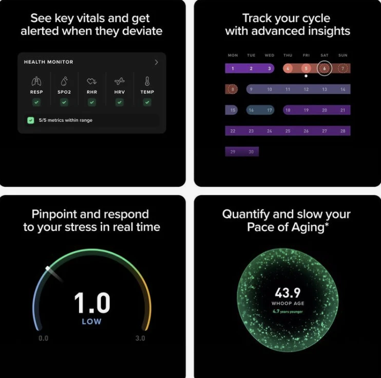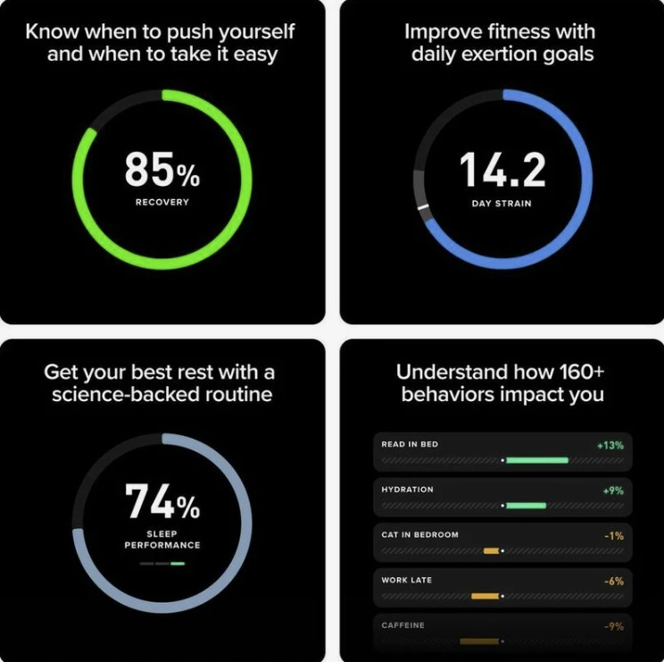 Continuous 24/7 monitoring: sleep, strain, recovery, HRV, respiratory rate, stress levels, and more.