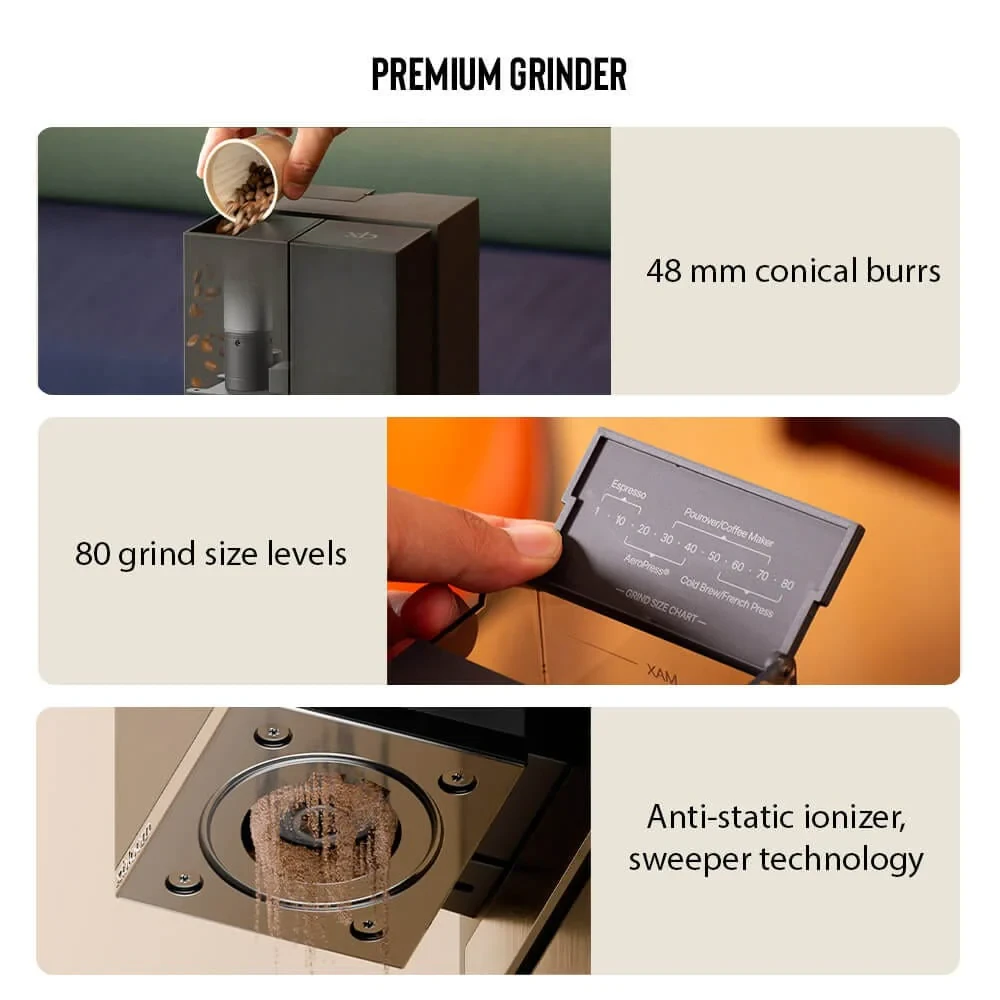 80-level adjustable grinder (48mm conical burrs, 60–120 RPM)