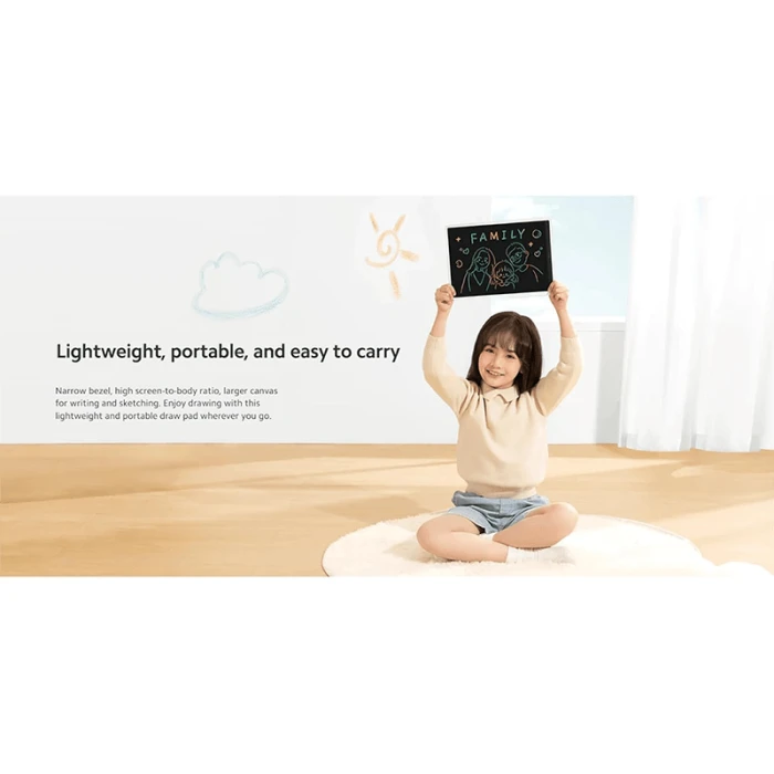 The Xiaomi LCD Writing Tablet 13.5 inches Color Edition offers a vibrant and portable drawing experience with a full palette of colors. Featuring a custom-made color liquid crystal film with gradient partitioning, it allows natural brushstrokes that change width with pressure. The magnetic pen stores safely in a designed nook, and the screen clears effortlessly with a simple tap on the Hall sensor area. Its lightweight, narrow bezel design provides a large canvas for writing or sketching anywhere. The dust-free, ink-free LCD screen protects your eyes with blue light filtering and natural light reflection, while the long-lasting battery supports up to a year of use with frequent screen clears.