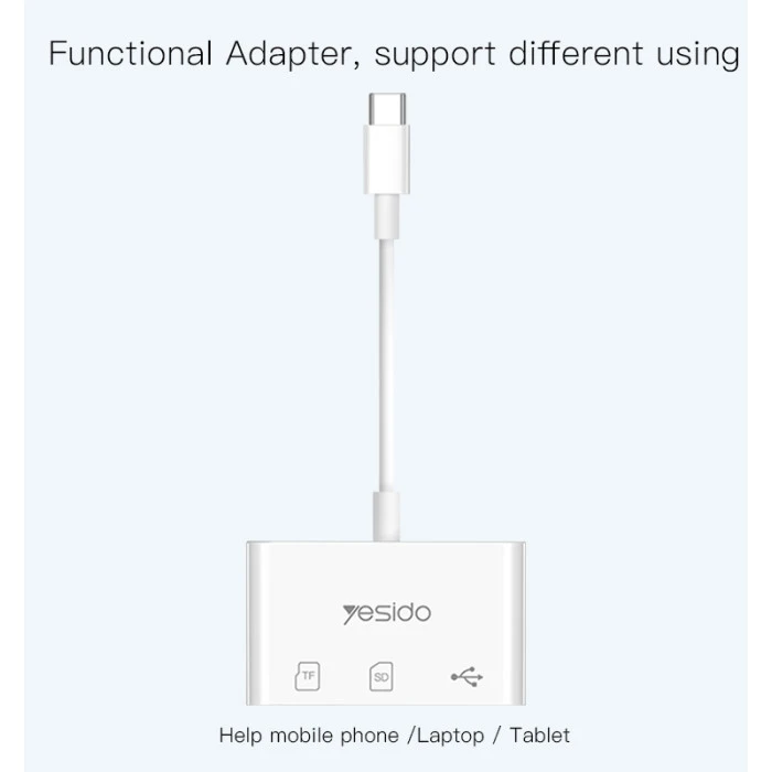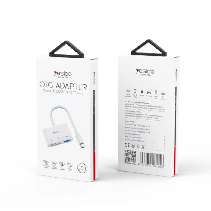 The Yesido GS16 USB-C OTG Adapter combines three essential ports in one compact device, making it perfect for expanding the connectivity of your USB-C devices. It features a USB 3.0 port for fast data transfer, along with SD and TF card slots for quick access to your media files. With support for PD quick charging, it allows you to keep your device powered while using peripherals. Ideal for connecting a mouse, keyboard, camera, USB flash drive, or mobile phone.