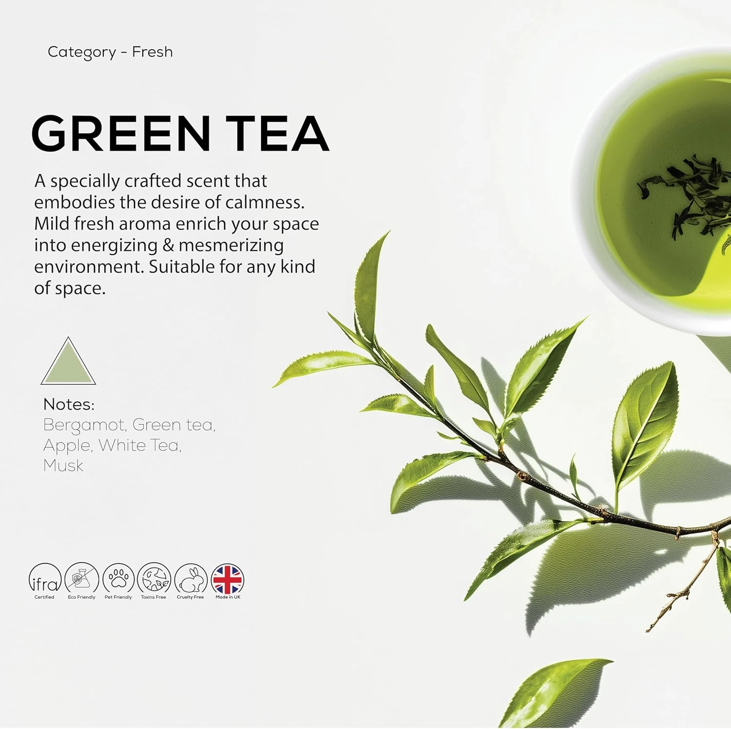 Green Tea blends fresh green tea with crisp apple and smooth white tea notes, giving a medium-strength scent that lasts—perfect for daily use at home, office, or any relaxing space.